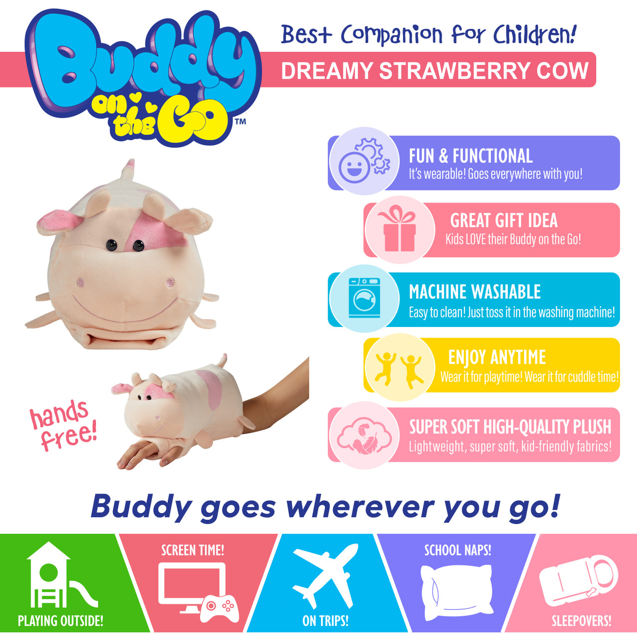 BEST BUDDY: Kids love this cute toy all day long, and will keep them close all night long! Always by their side for hands free fun wherever they go! A comfy travel friend for any child on road trips & airplane rides. Hands-free fun for all ages! Take your buddy everywhere you go!