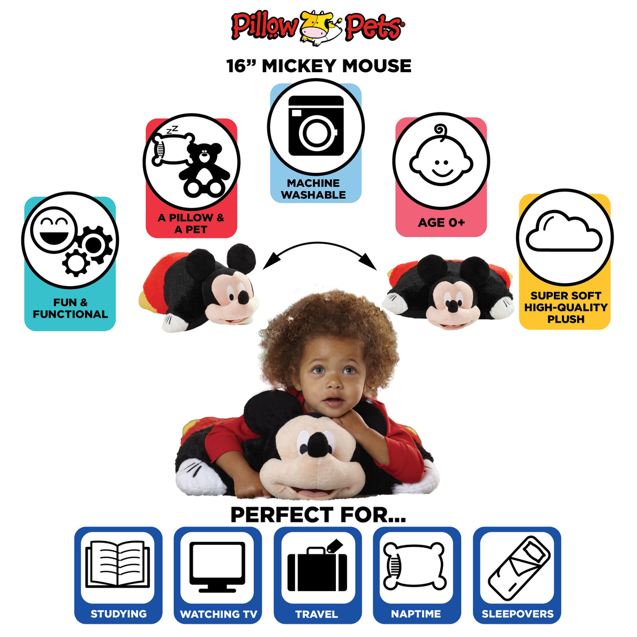 Pillow Pets presents super soft stuffed animals that unfold into comforting pillows for sleep. Kids, teens & adults love these classic & collectible comfy stuffed animals. Disney’s Mickey and Minnie Mouse Pillow Pets are pals during the day, and then unfasten to become pillows at night! Children of all ages will love these original toys for play & as large pillows for reading, watching television, studying, and nap time.