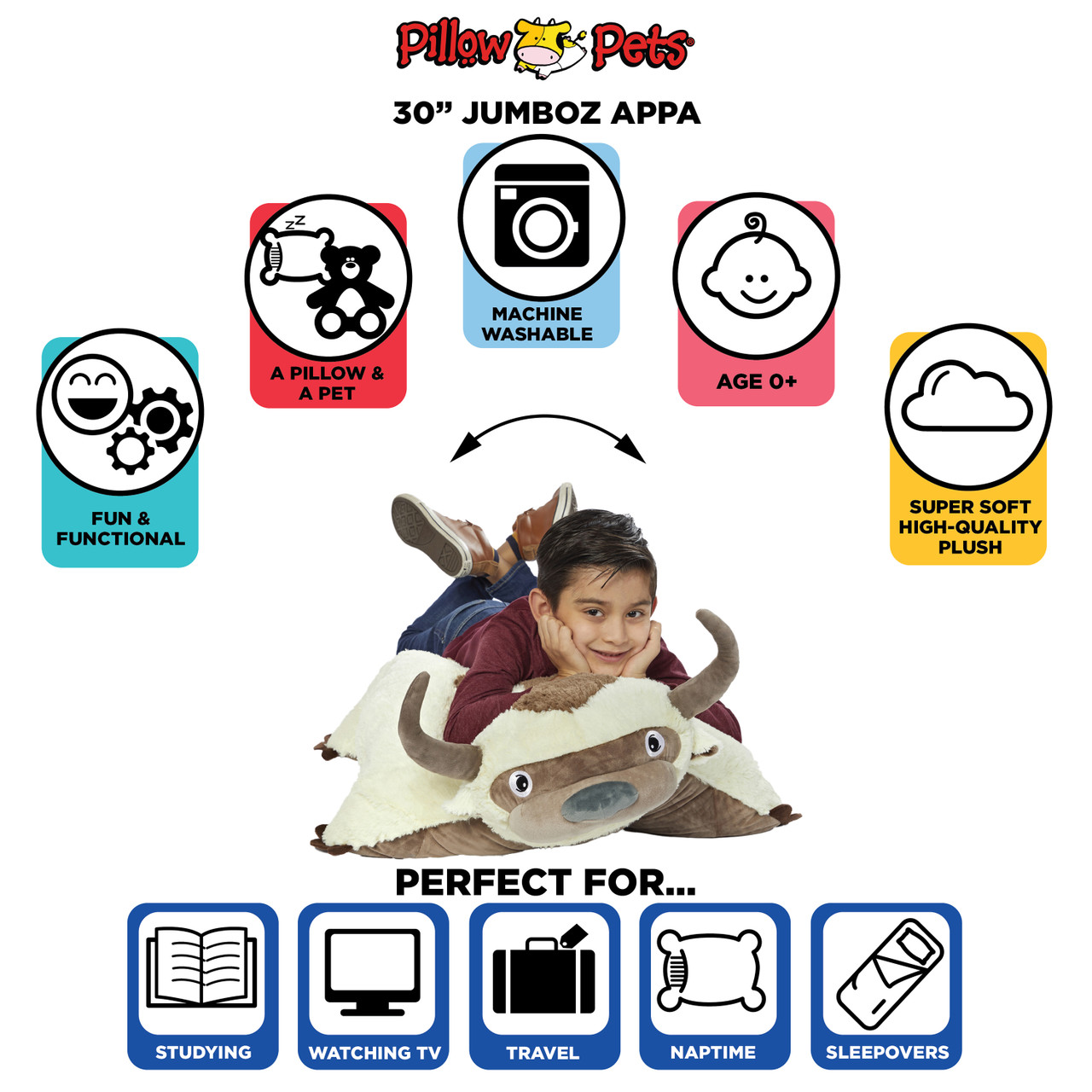Appa from the hit Nickelodeon animated television series Avatar: The Last Airbender and the film The Last Airbender is now a JUMBO Pillow Pet! Simply sweet, fluffy and fabulously soft, this HUGE Pillow Pet is perfect for playtime, anthe best cuddle buddy at bedtime. Surprise your little one with a Jumbo Appa Pillow Pet that they will love endlessly as a child, snuggle with as a teen, and end up taking to college. Pillow Pets bring joy, security, comfort and smiles to all ages. Super soft, parent approved, fun and functional, high quality plush designs that last through childhood and beyond.