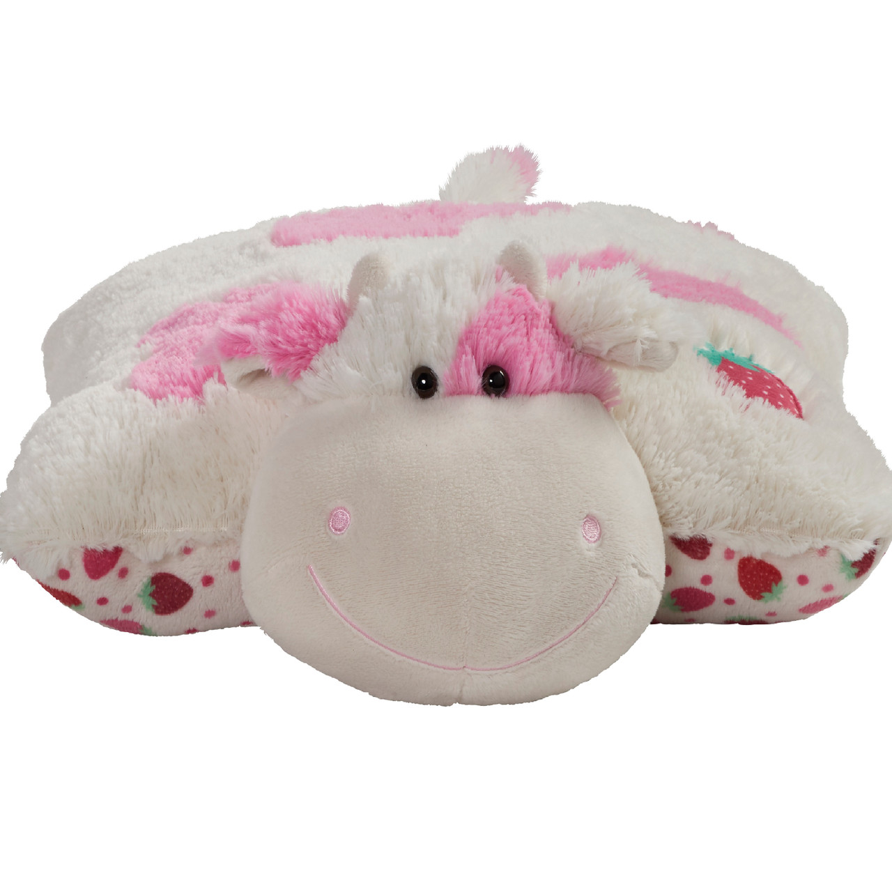 - STRAWBERRIES ‘N CREAM: Sweet Scented Pillow Pets deliver the scent of yummy sweet treats in a giant plush you can hug. Strawberry Milkshake Cow has a scent patch that smells like a strawberries – so yummy!