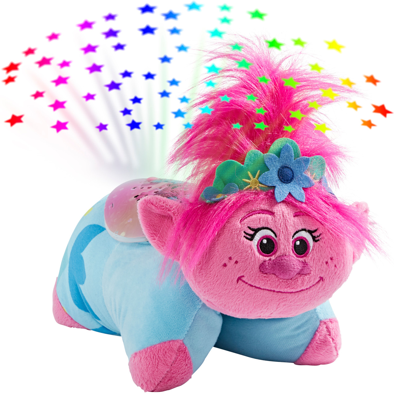 • IT’S HUG TIME! With her pink hair, blue dress, flower crown, and happy attitude, Poppy can do anything, whether she’s uniting trolls in Trolls World or lighting up your bedroom as a Sleeptime Lite.